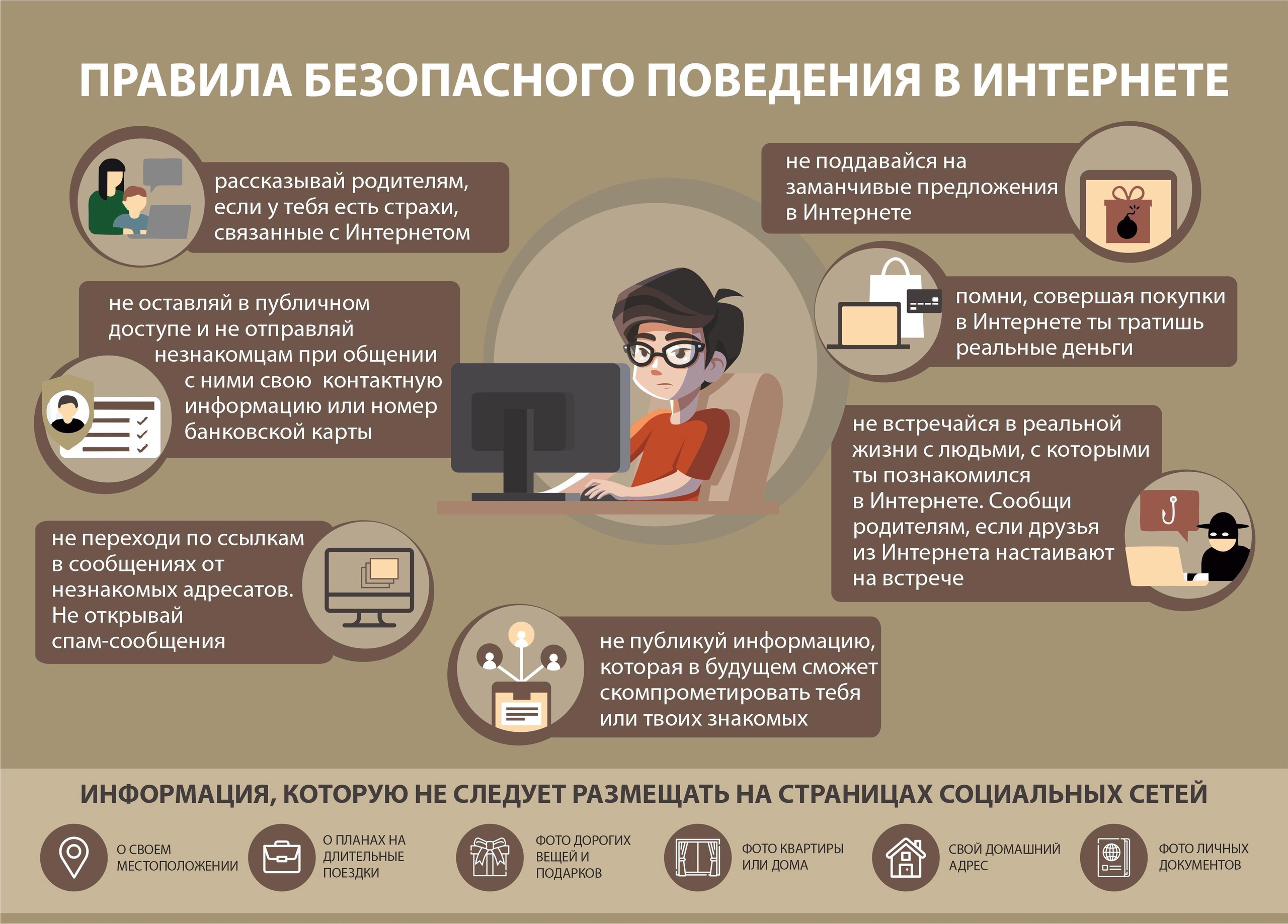 Не встречайся с людьми, с которыми познакомился в Интернете, без родителей. Многие люди выдают себя не за тех, кем являются на самом деле.