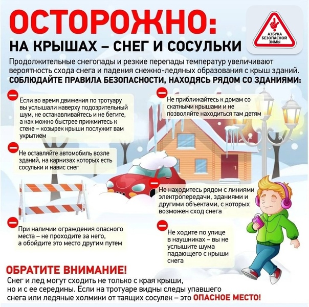не приближаться к крышам зданий, с которых возможен сход снега, и не позволять находиться в таких местах детям;
