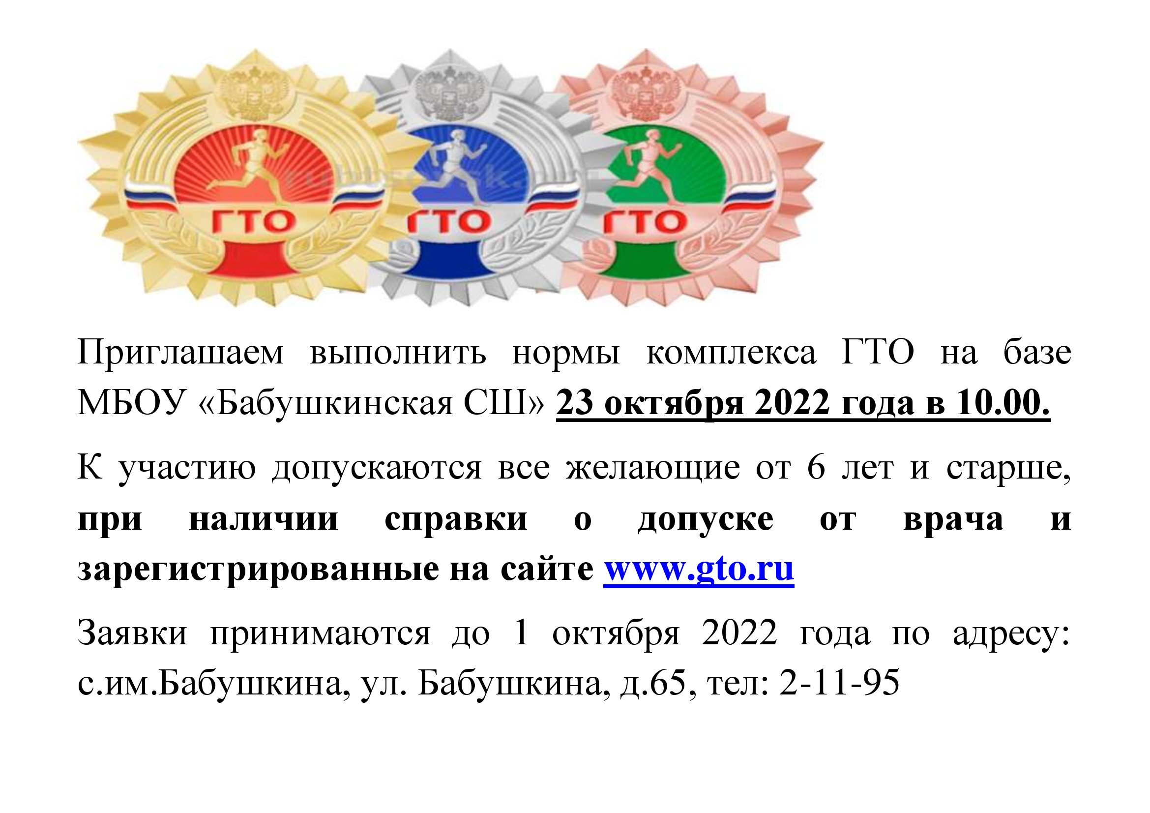 4 июня на стадионе Бабушкинской средней школы прошел прием норм ГТО у ребят из села имени Бабушкина. Показали свою сноровку, силу, меткость, скорость ребята от 6 до 17 лет, сдав нормативы на золотые, серебряные и бронзовые значки! Прием нормативов вели судьи Долговская Л.В., Тарутина М.Ю., Власов М.М., Бахарев В.В. Все ребята молодцы! И пусть у кого-то сегодня что-то не получилось, у вас, ребята, есть время для тренировок, в следующий раз все обязательно получится!